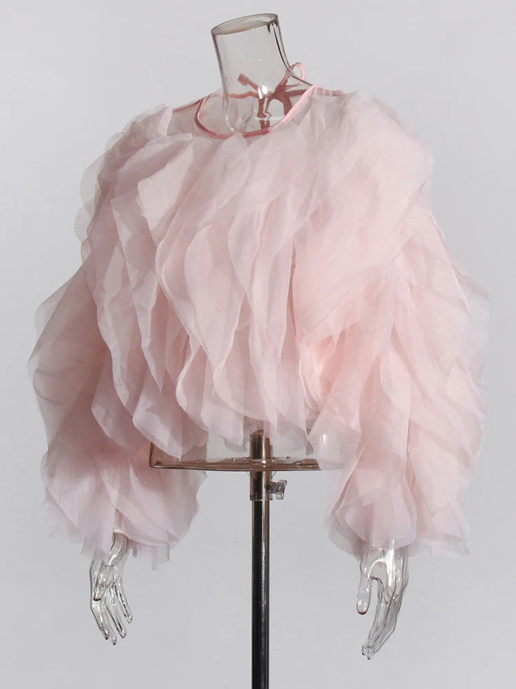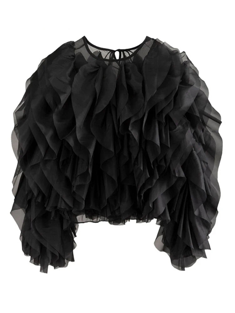 Vintage Patchwork Ruffle Shirt O Neck Lantern -Long Sleeve